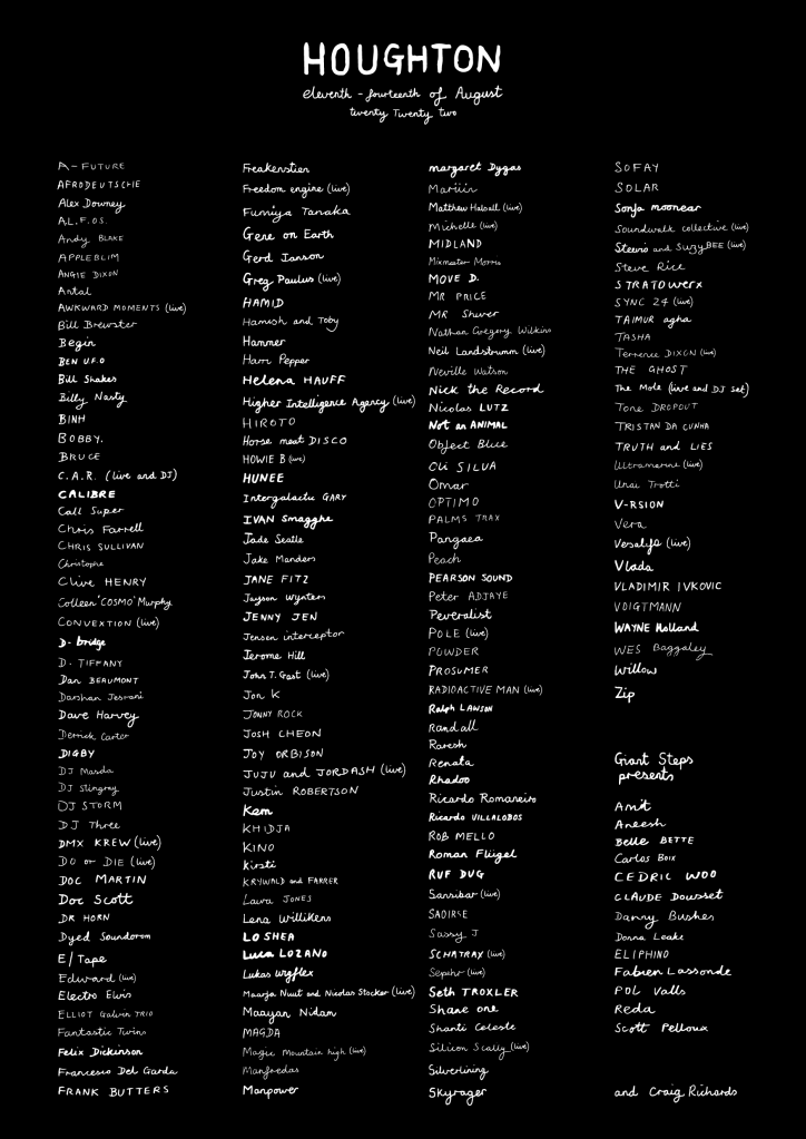 “With great pride we present the program of music for Houghton 2022. Our intention has always been to honour the festival that didn’t happen in 2019. With the return of possibilities we finally have the chance to build upon the joy of year one and two. We look forward to successfully celebrating year three in year six. None of us could have imagined such a suspenseful and prolonged journey to the summit. But get there we shall. Preparations are fully under way, The magic of Houghton will soon return.” – Craig Richards