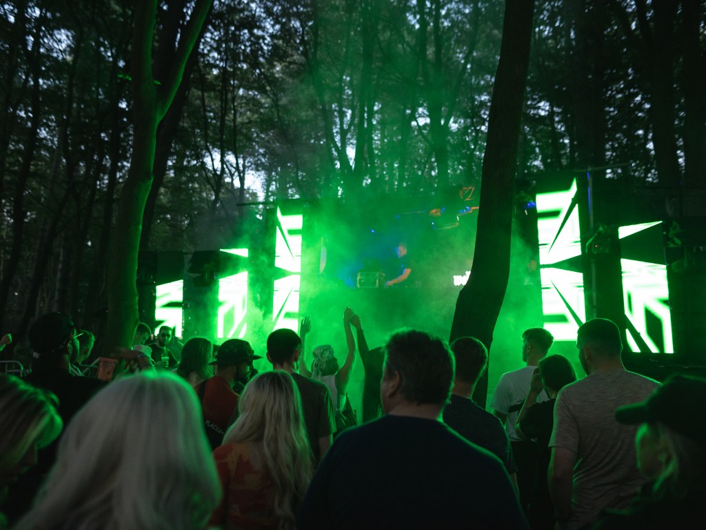 When the lights go down at The One In The Woods the techno stage transforms into a woodland ravers haven. Under the cover of darkness (and a lot of haze) the lighting and lasers come alive and hit on a different level. Blitzing between strobes, multi-coloured lasers, and spotlights – a flurry of light dazzles the crowd and dowses the woodland with a sinister vibe.