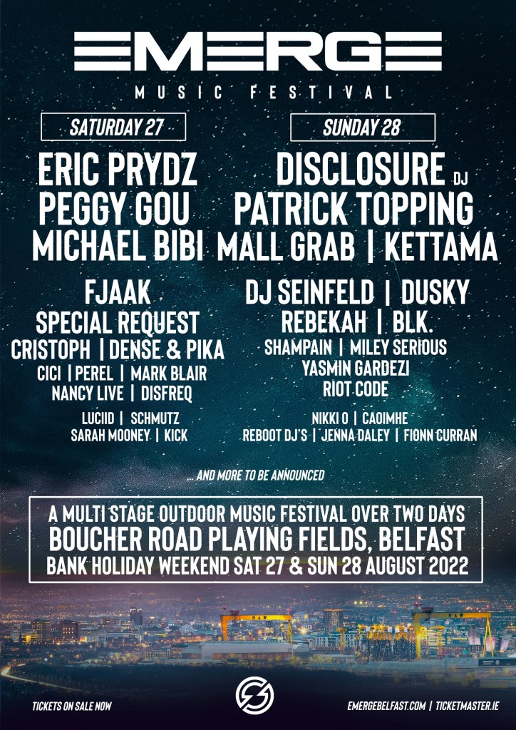 EMERGE Music Festival is a brand new annual two day multi stage outdoor event brought to you by the teams behind long running Belfast club brand Shine & Belsonic Festival. Over 40 acts will appear across three stages, over the two days. Bespoke Sound & Lighting / AV installations is across all stages, with an emphasis on a world class audience experience.