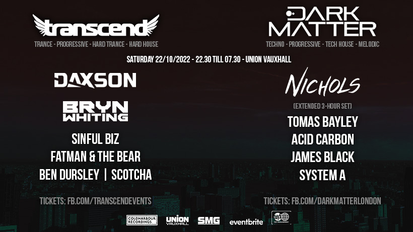 Transcend and Dark Matter return on October 22nd with a massive lineup of Trance and Techno across two rooms under the arches at Union Club, Vauxhall. Expect heavy hitting rhythms and uplifting melodies all night.