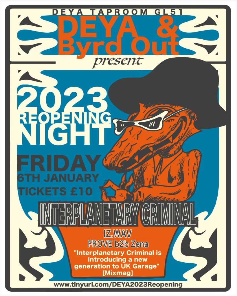 Kicking off the opening of the tap room for 2023 is none other than the Baddest Of Them All, Interplanetary Criminal. Expect a night of bad boy UKG and breaks, with support from Byrd Out de facto resident iz.wav, alongside Frove and Zena.