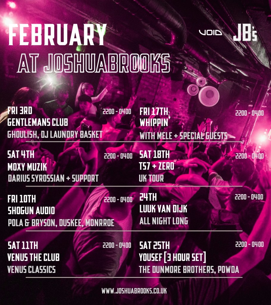 The rest of February will see big labels and artists, expect shows from Melé for the Whippin’ label party, TS7 takes over for his headline tour, Luuk van Dijk all night long and Yousef plays a 3 hour set with others in support. Check out the February listings below.