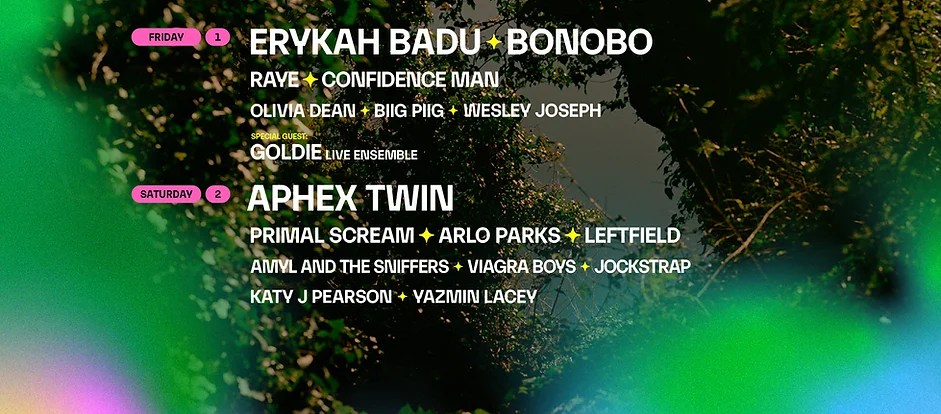 Friday night will see headline shows from the queen of neo-soul Erykah Baduh and melodic maestro Bonobo. Joining them on the day are the likes of Biig Piig, Confidence Man, Olivia Dean, Wesley Joseph, and a special guest live ensemble show from dance music legend Goldie. Another of the festival’s highlights will be a performance by the internationally acclaimed electronic musician Aphex Twin, who will be headlining on Saturday night. Joining them are a selection of huge acts including Primal Scream, Leftfield, Arlo Parks, Amyl and the Sniffers, Viagra Boys, Jockstrap, Katy J Pearson, and Yazmin Lacey.