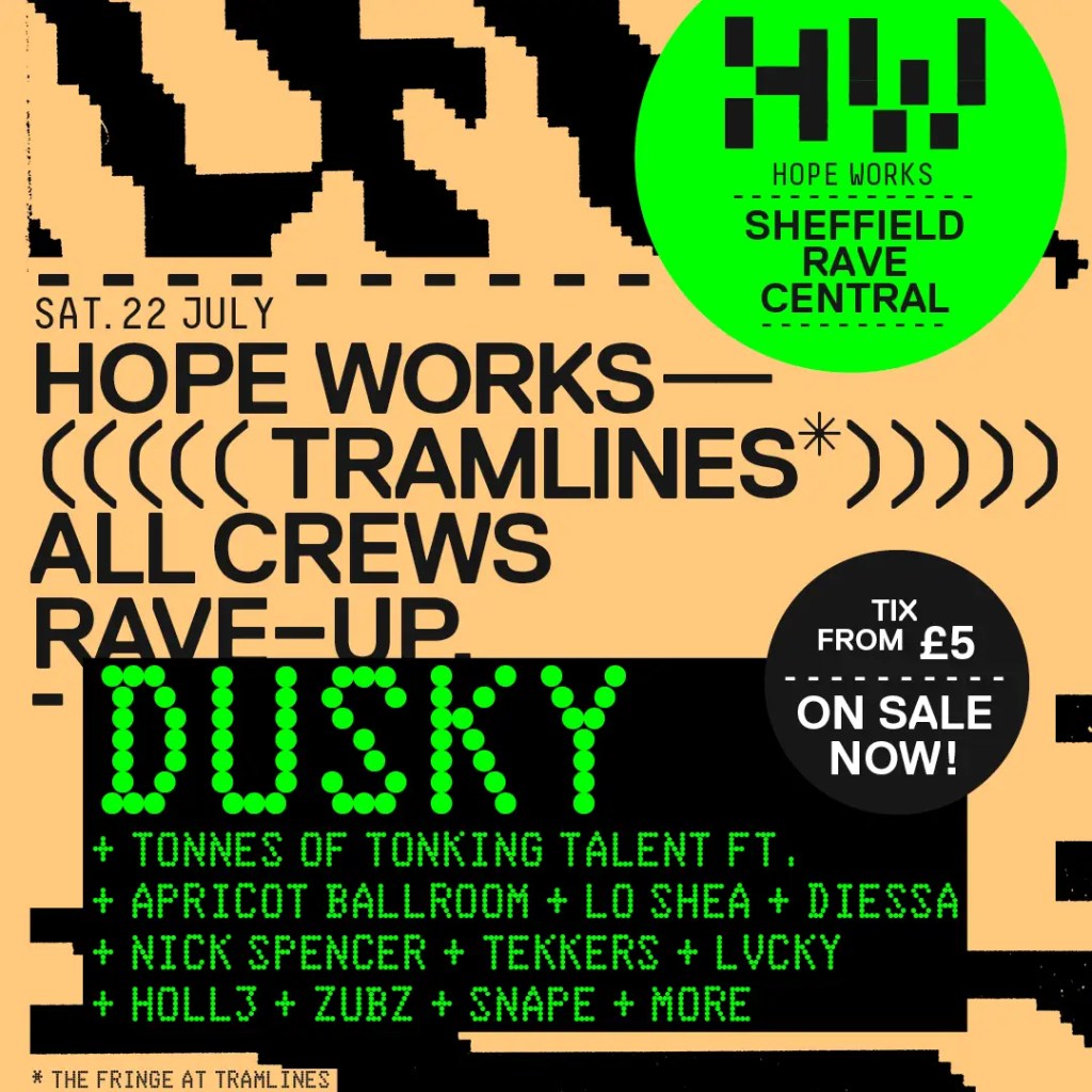Hope Works present their annual Tramlines after party with an all night outdoor party featuring house and garage titans Dusky, Lo Shea, Apricot Ballroom and many more of Sheffield’s brightest talents in support.