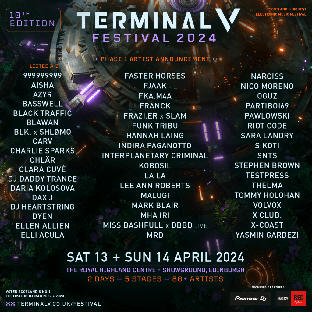 Scotland’s renowned electronic music festival, Terminal V, is set to make a triumphant return to the Royal Highland Centre in Edinburgh for its milestone 10th edition. Scheduled for the weekend of April 13th and 14th, 2024, the festival promises an immersive experience featuring cutting-edge production, world-class sound, and performances from over 80 international artists and local talents.