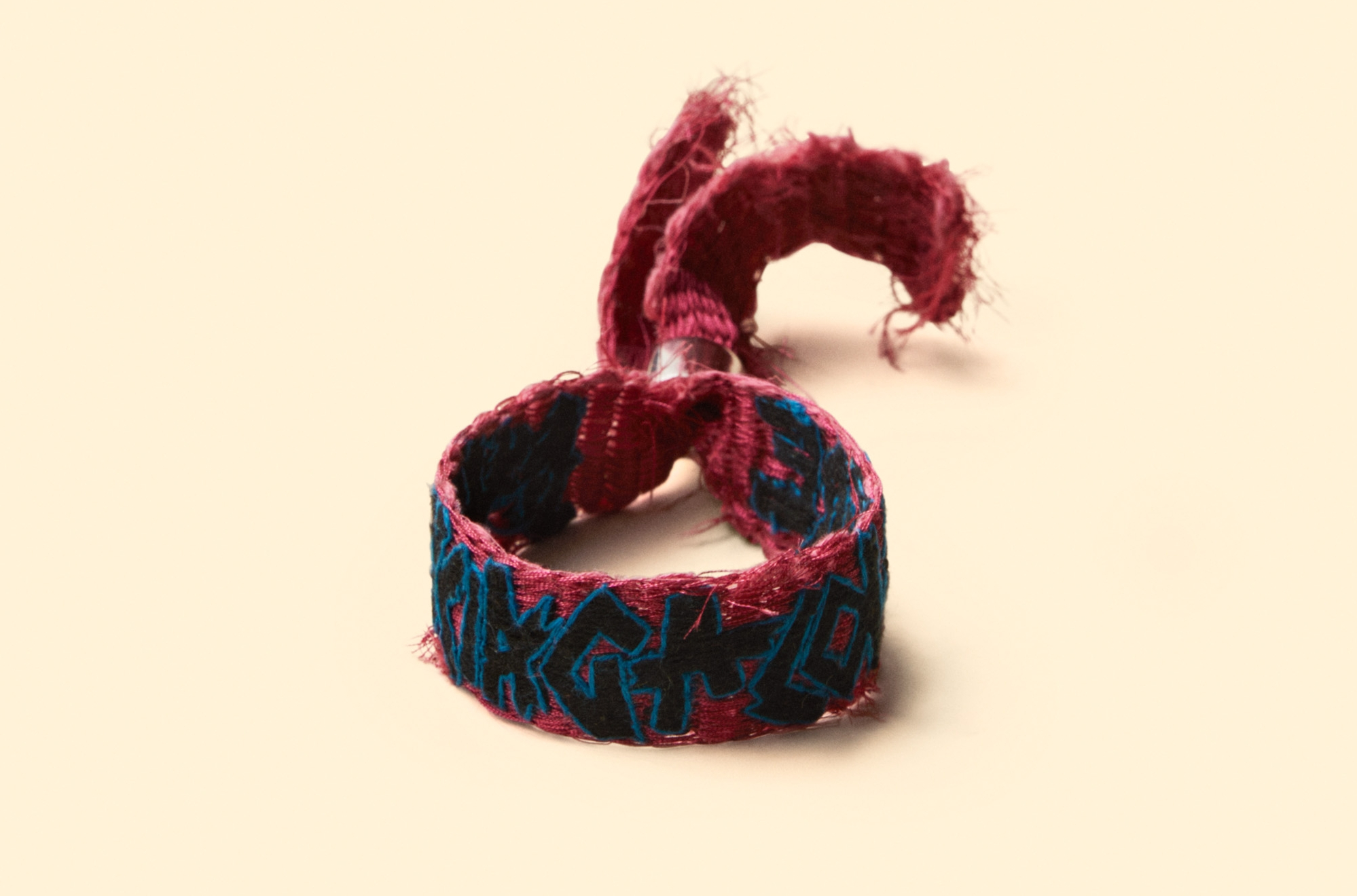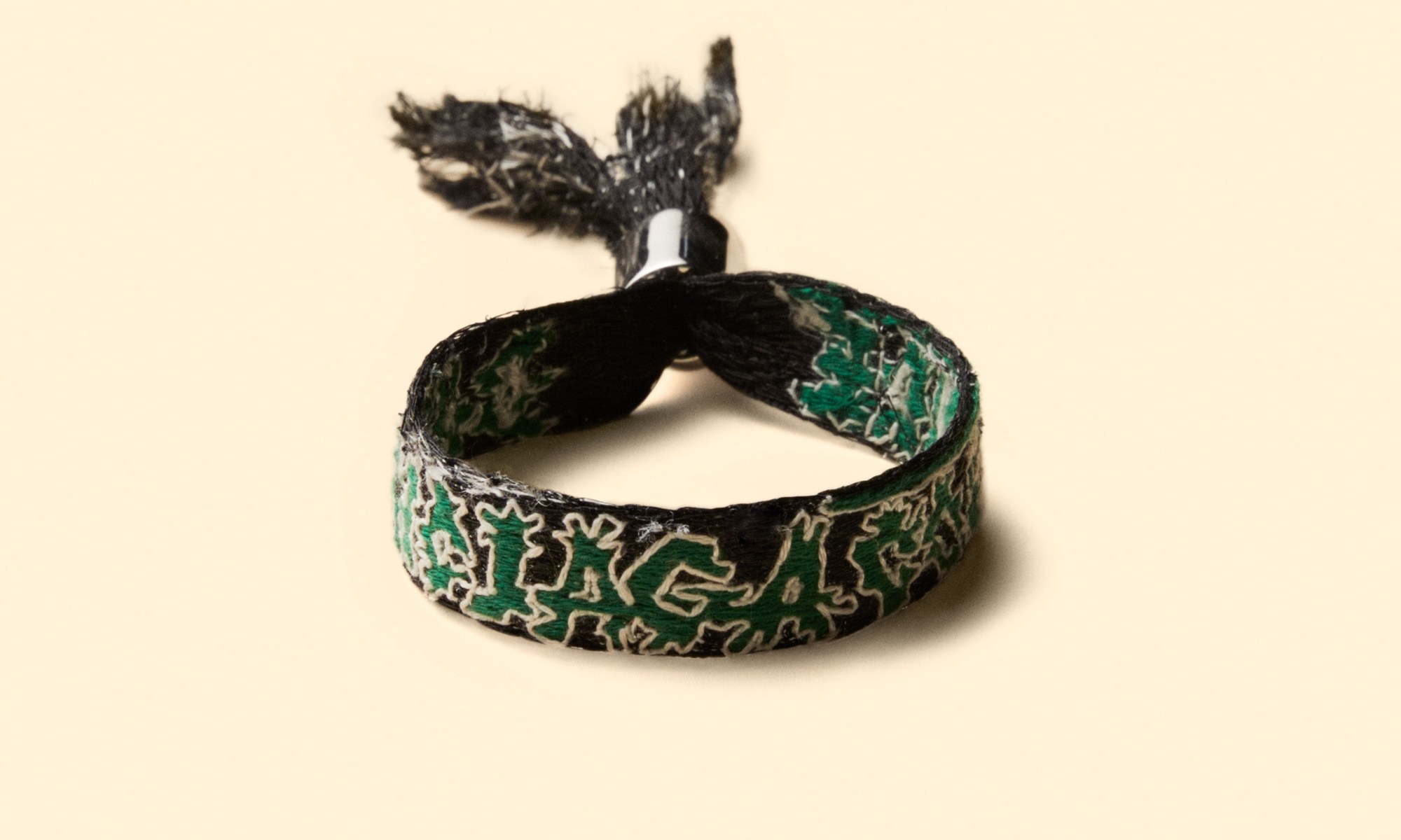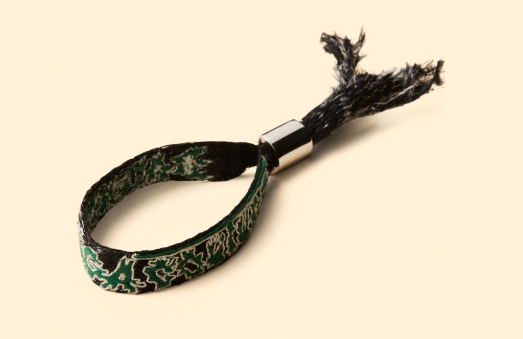 These hand-embroidered bracelets, made in France, look like worn festival wristbands and are crafted using traditional artisanal techniques from the 1850s, such as seed stitch, drawn thread work, point de Boulogne, satin stitch, stem stitch, and front-and-back chain stitch.