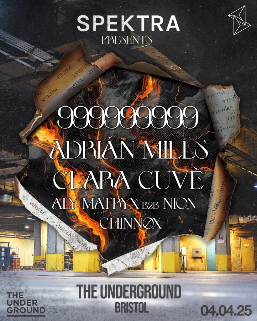 Bristol’s subterranean venue, The Underground, is set to host a night of hard-hitting techno as Spektra presents a triple-headliner event featuring genre heavyweights 999999999, Adrian Mills, and Clara Cuvé. Taking place on April 4, 2025, the lineup also includes support from rising talents Chinnøx, Aly Matryx, and Nion.